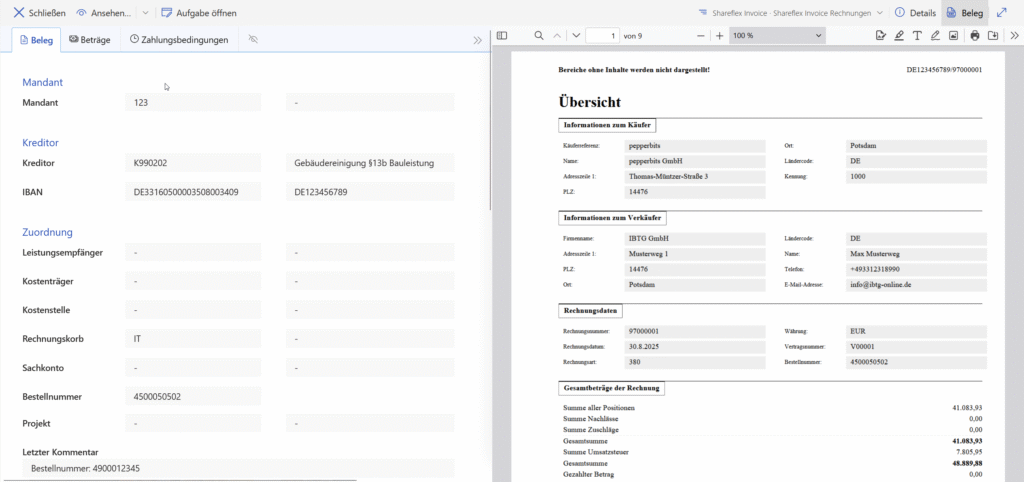 Anschließend erfolgt eine manuelle Prüfung und Freigabe der Rechnung. Wenn Sie eine elektronische Rechnung verarbeiten, stellt Ihnen Shareflex Invoice dabei automatisch eine grafische PDF-Version zur Verfügung. Das ist enorm hilfreich, denn das Format XRechnung beispielsweise wird im Gegensatz zu ZUGFeRD ausschließlich in einem maschinenlesbaren XML-Format ausgeliefert. Dies macht die manuelle Sichtprüfung fast unmöglich und Shareflex Invoice erleichtert Ihnen diesen Schritt enorm.